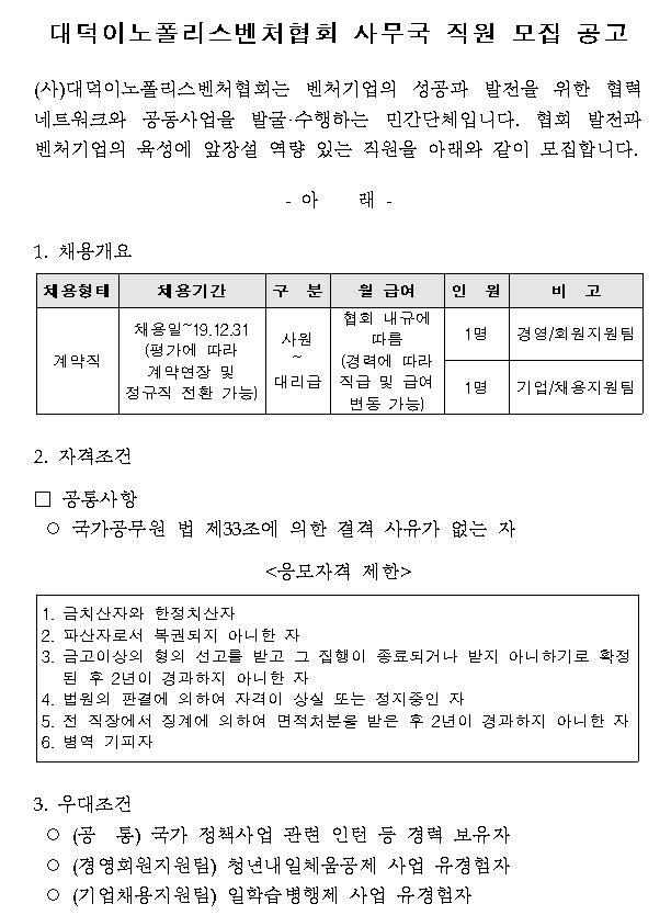 대덕이노폴리스벤처협회 사무국 직원 모집 공고