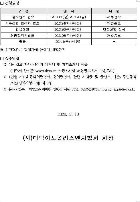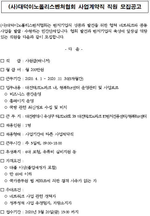 대덕이노폴리스벤처협회 사업직 직원 모집 공고