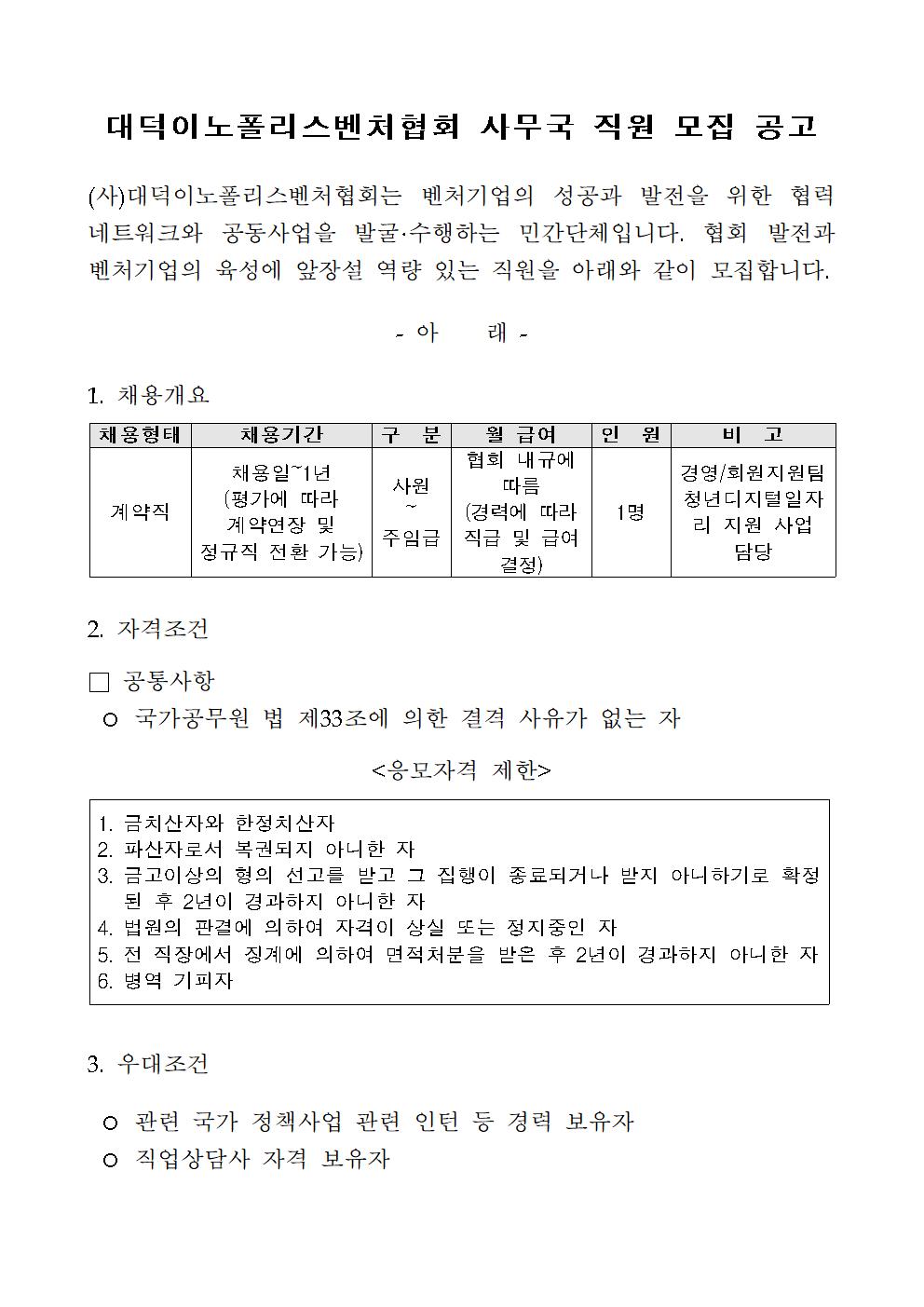 대덕이노폴리스벤처협회 사무국 직원 모집 공고