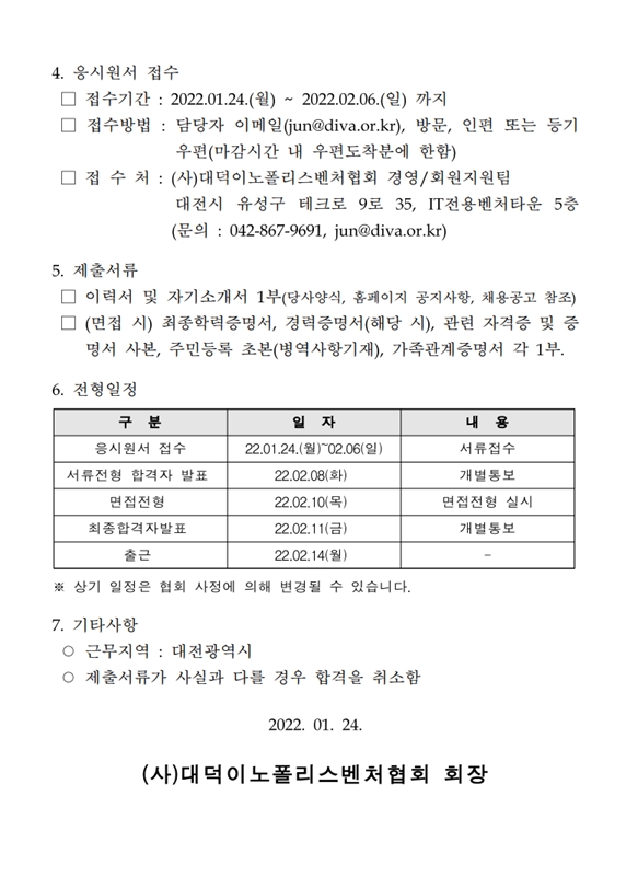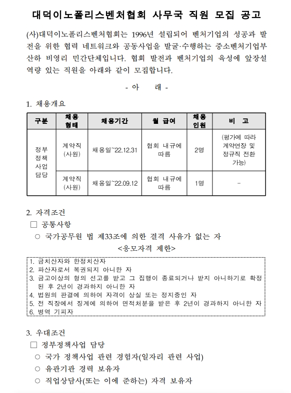 대덕이노폴리스벤처협회 사무국 경력직 및 신입직원 모집 공고
