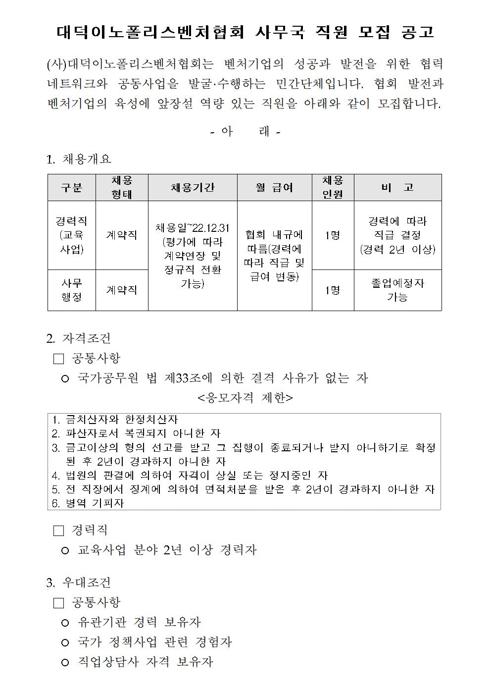 대덕이노폴리스벤처협회 사무국 계약직 직원 모집 공고