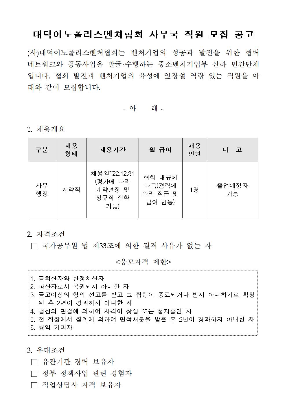 대덕이노폴리스벤처협회 사무국 계약직 직원 모집 공고