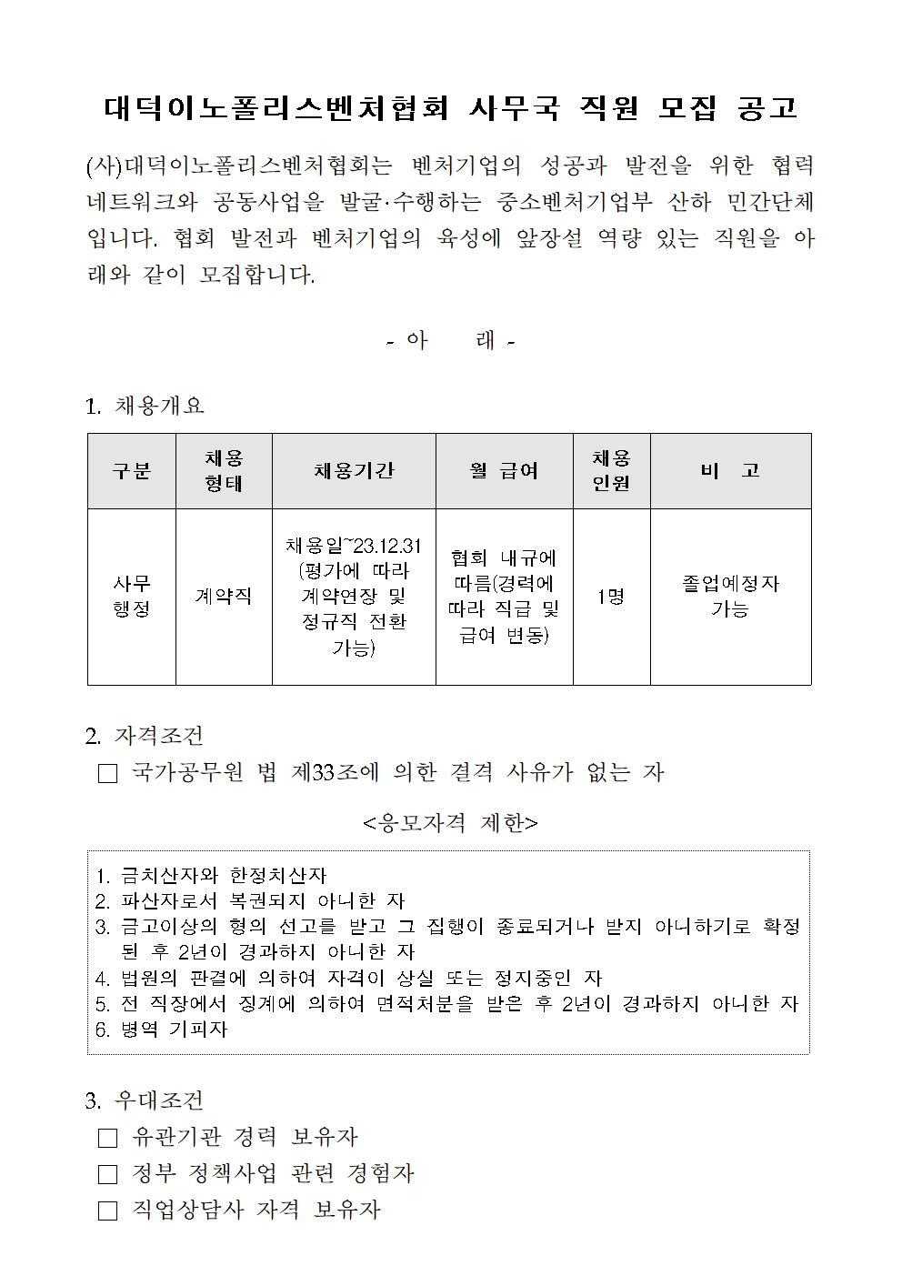 대덕이노폴리스벤처협회 사무국 계약직 직원 모집 공고