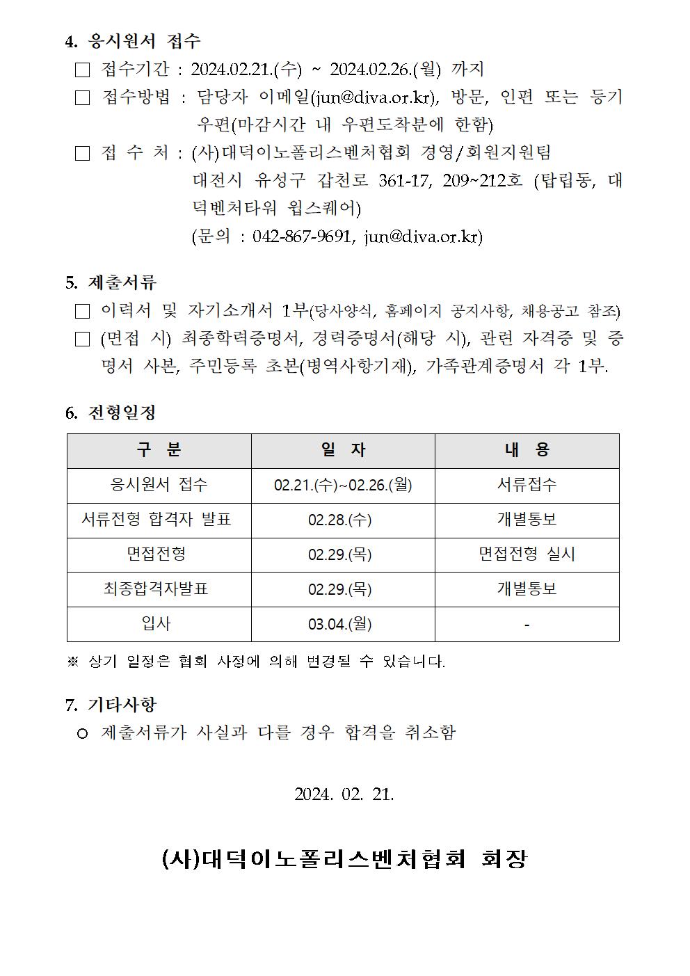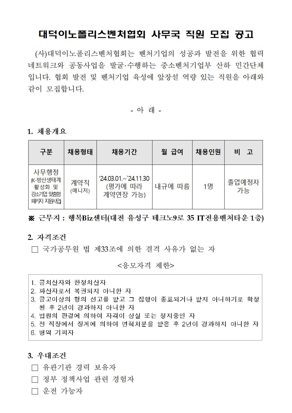 대덕이노폴리스벤처협회 사무국 계약직 직원 모집 공고(3명)