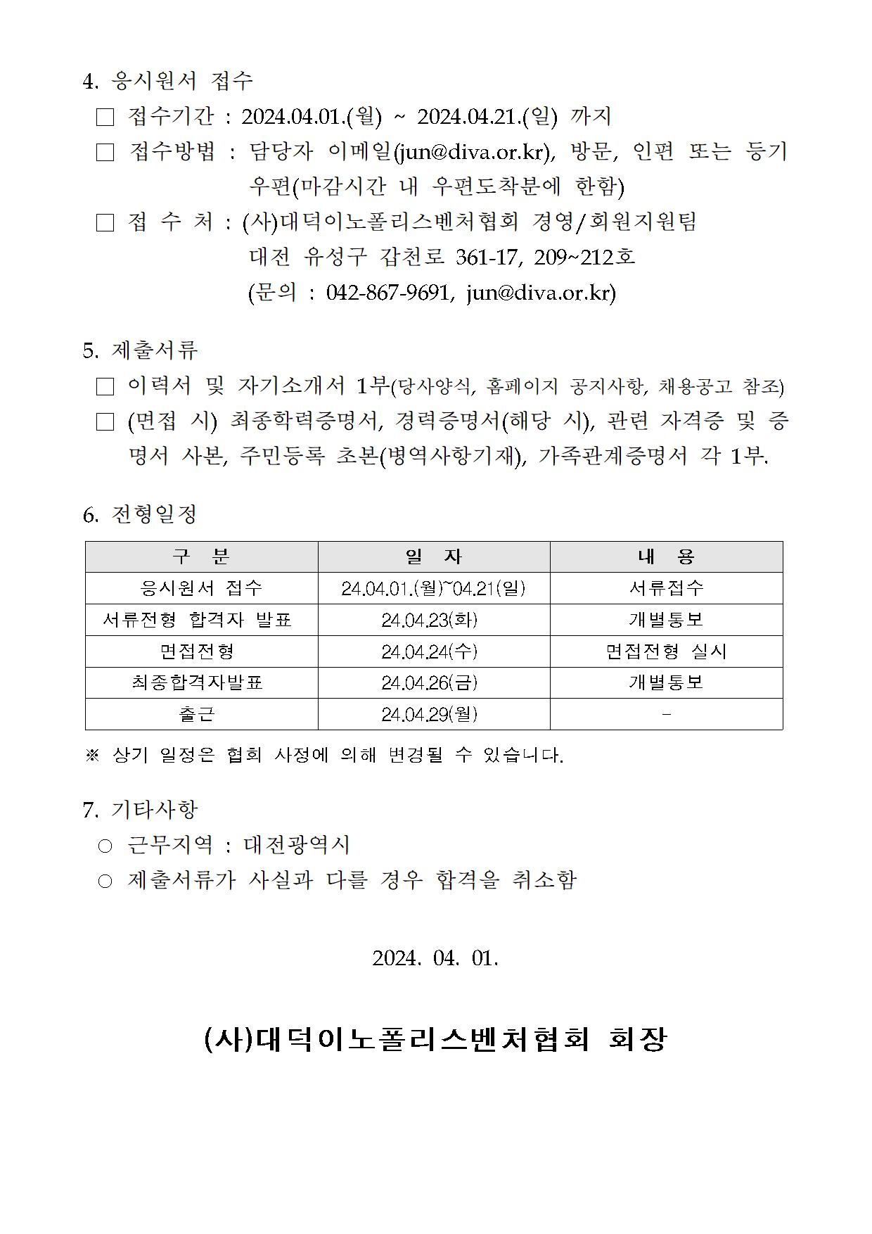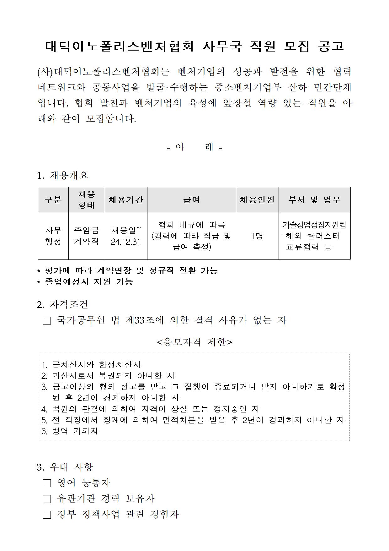 대덕이노폴리스벤처협회 사무국 계약직 직원 모집 공고(3명)