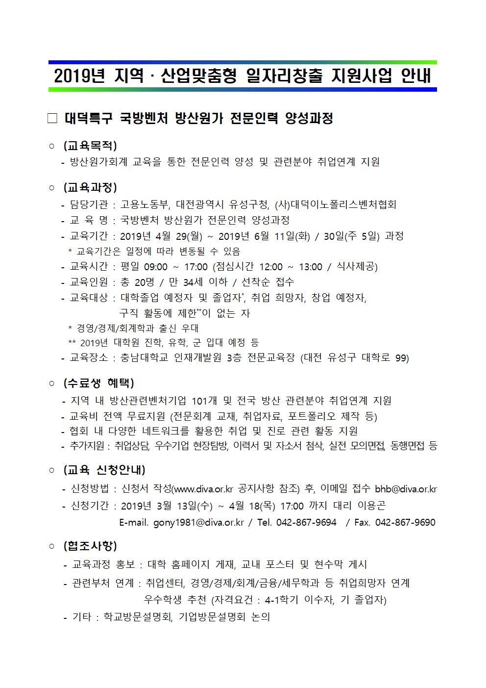 2019년 대덕특구 국방벤처 방산원가 전문인력 양성과정 참여자 모집 공고(수정)