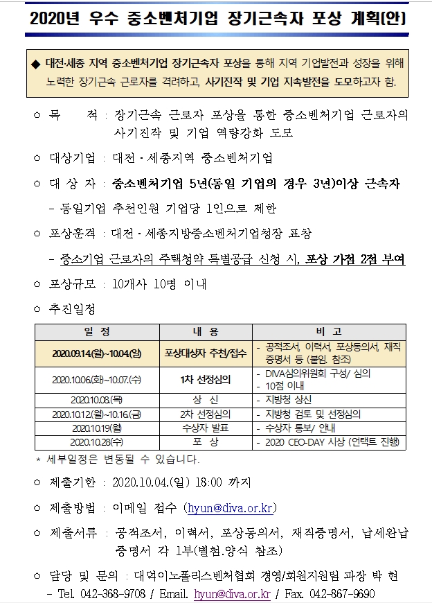 [장기근속자 포상] 2020 우수 중소벤처기업 장기근속 근로자 포상 추천 안내