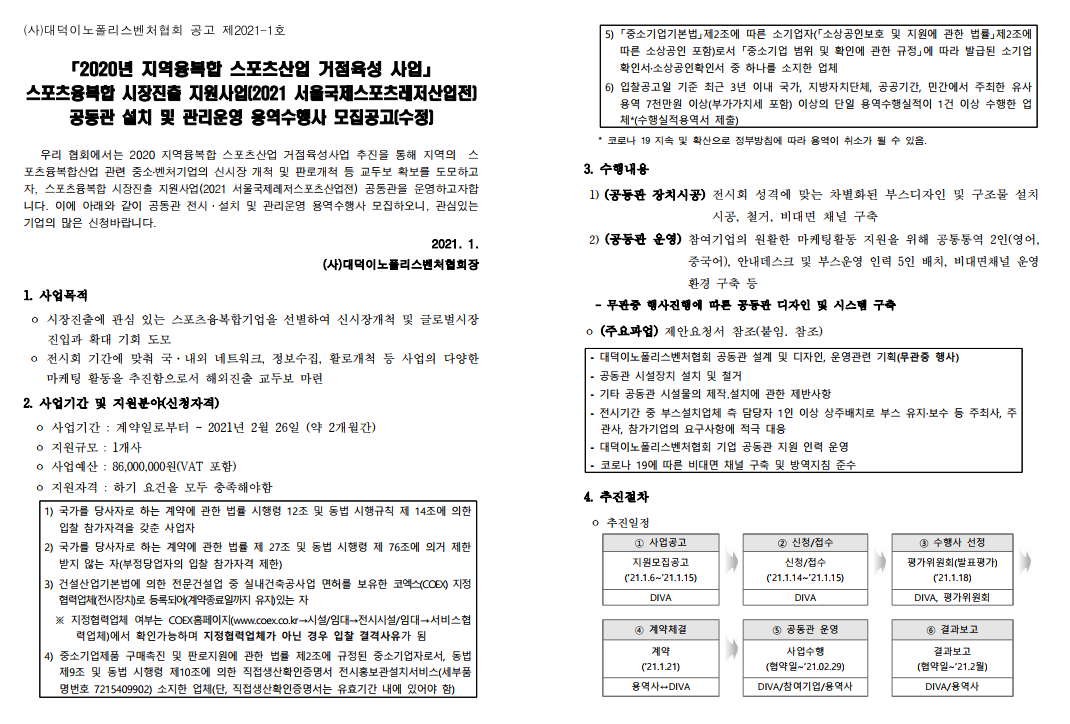 [공고] 스포츠융복합 시장진출지원사업 공동관 설치 및 관리운영 용역수행사 모집