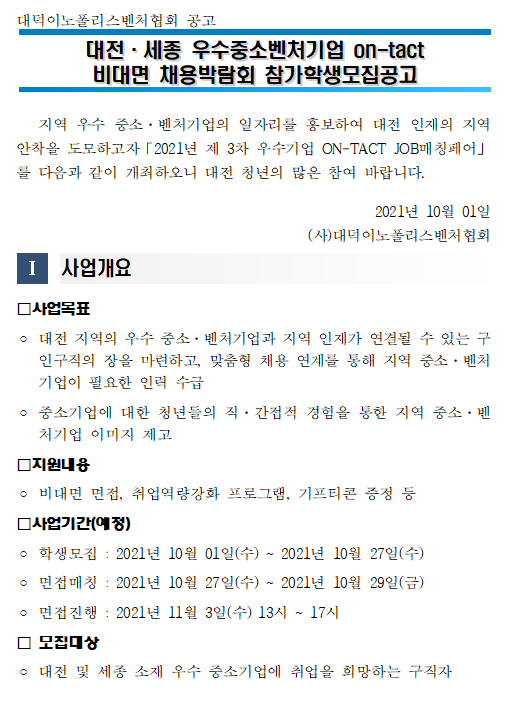 [공고] 대전세종 중소벤처기업 비대면 채용박람회 참여 구직자 모집