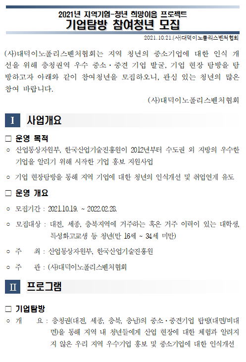 [공고] 2021년 희망이음 프로젝트 충청권역 우수기업 탐방 청년 모집