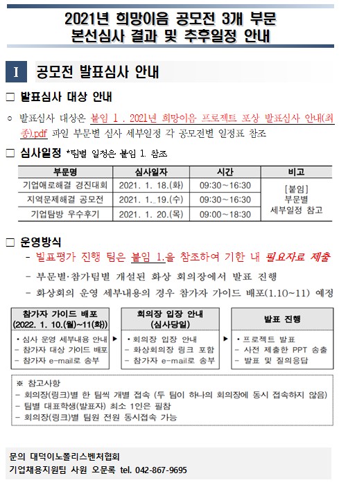 [안내] 희망이음 프로젝트 3개 부문(지역문제, 기업애로, 탐방후기) 공모전 발표심사 대상 및 추후 일정 공지