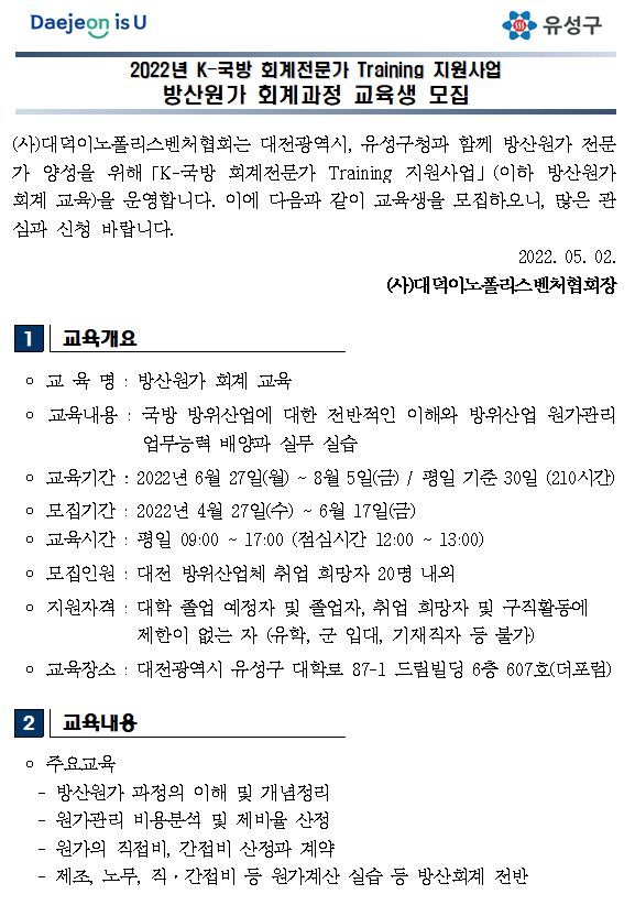 K-국방 회계전문가 방산원가 회계과정 교육생 모집