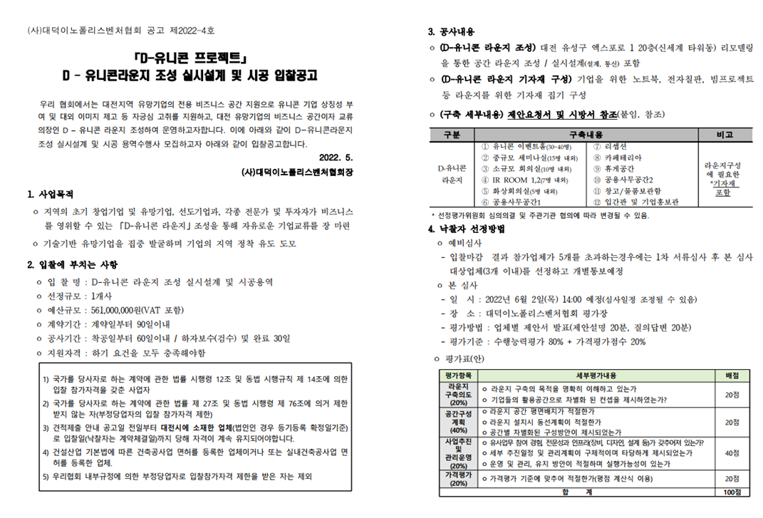 [공고]2022년 D-유니콘라운지 조성실시설계 및 시공 용역수행사 입찰공고