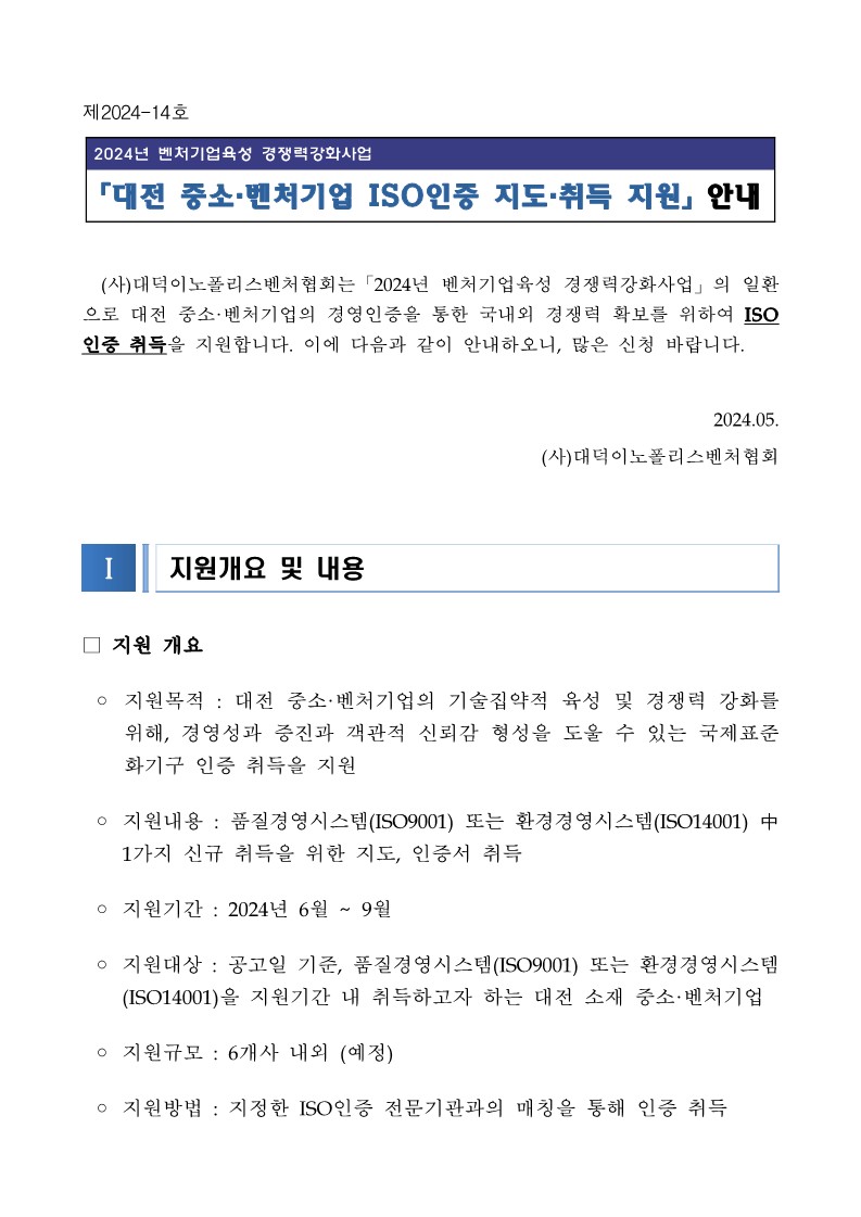 [참여기업모집] 2024년 대전 중소벤처기업 ISO인증 지도 및 취득 지원 안내
