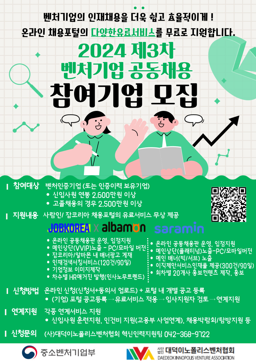협회에서는 2024년 제3차 벤처기업 공동채용 참여기업을 모집하고 있습니다.