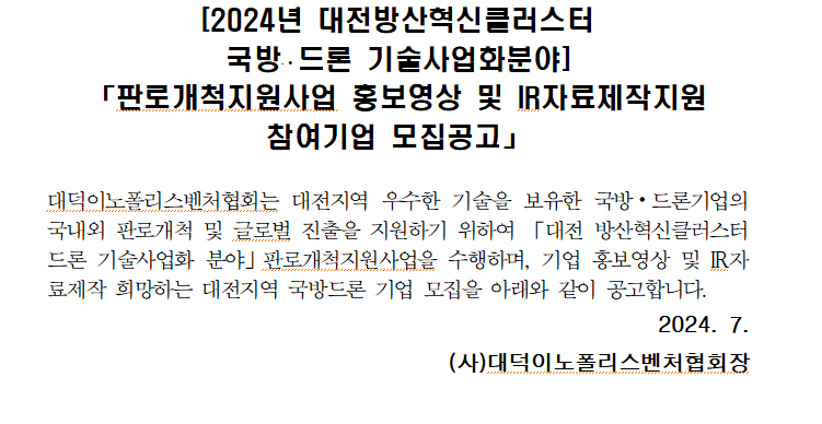 대전 국방드론기업의 홍보역량강화를 위한 홍보영상 및 IR자료제작지원 참여기업을 모집합니다.