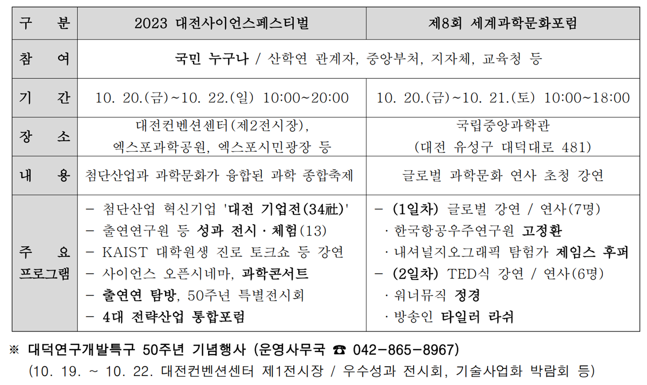 대전광역시에서 금번 개최되는 '대표 과학축제' 2023 대전사이언스페스티벌과 제8회 세계과학문화포럼을