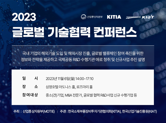 다가오는 11월 6일(월) 산업부 주최 KITIA(한국소재부품장비투자기관협의회), KIAT 공동주관의 '2023 글로벌 기술협력 컨퍼런스'를 개최합니다.
