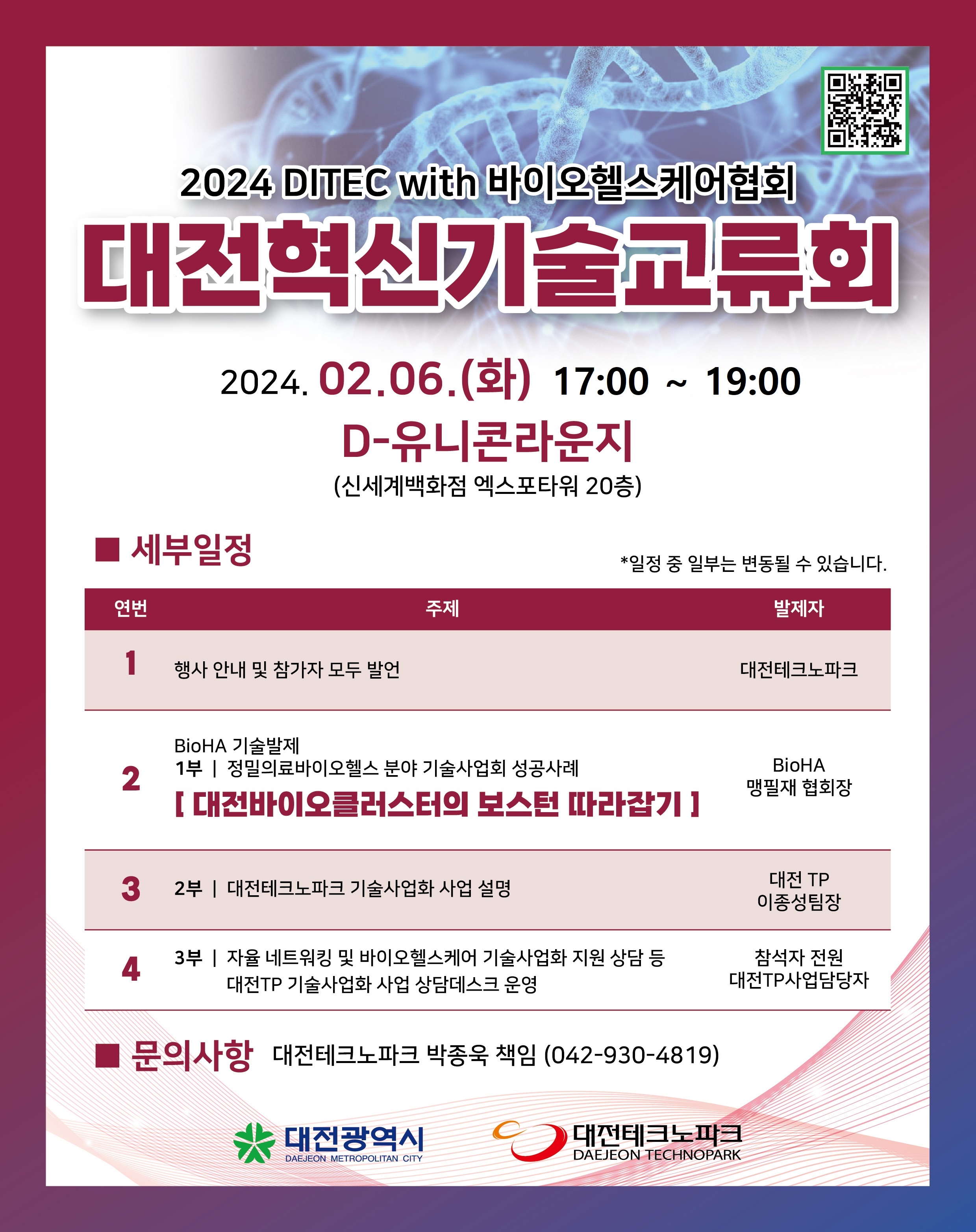 4. 문의처 : 대전테크노파크 기술사업화팀 박종욱 책임 042-930-4819 / 송후섭 책임 042-930-4817