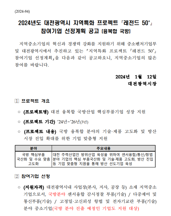 [대전테크노파크] 2024년도 대전광역시 지역특화 프로젝트 「레전드 50+」 참여기업 모집 안내