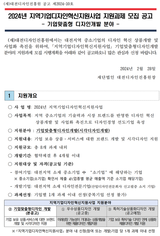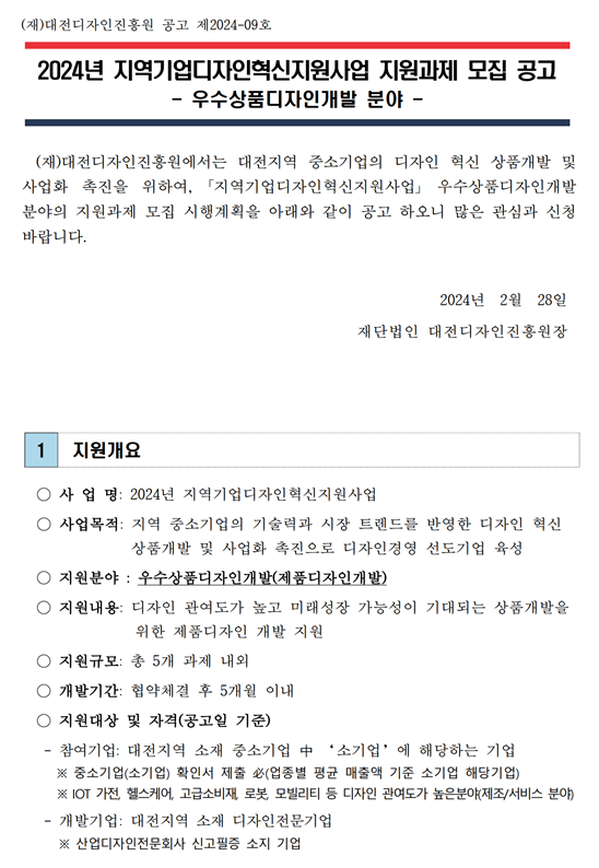 금번 대전디자인진흥원에서는 대전지역 중소기업의 디자인 혁신 상품개발 및 사업화 촉진을 위하여 「2024년 지역기업디자인혁신지원사업」을 수행하고있습니다.