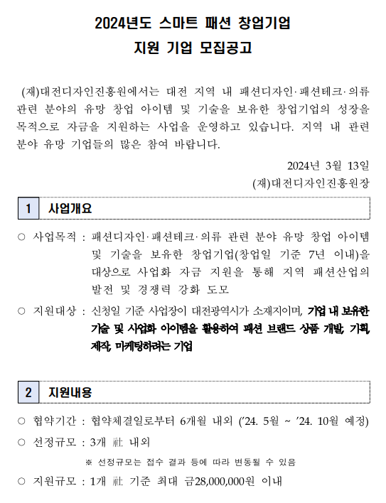 [대전디자인진흥원] 2024년 스마트 패션 창업 지원 기업 모집 안내