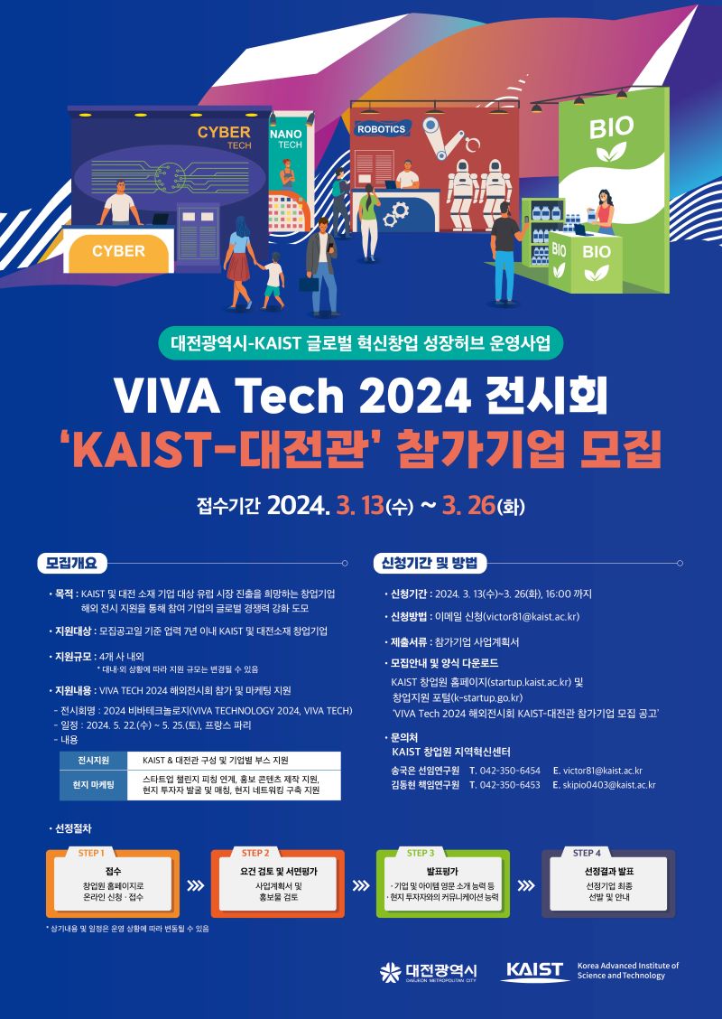 대전시와 카이스트가 협력하여 지원하는 VIVA Tech 2024 해외전시회 참가 지원 사업을 아래와 같이 안내드립니다.