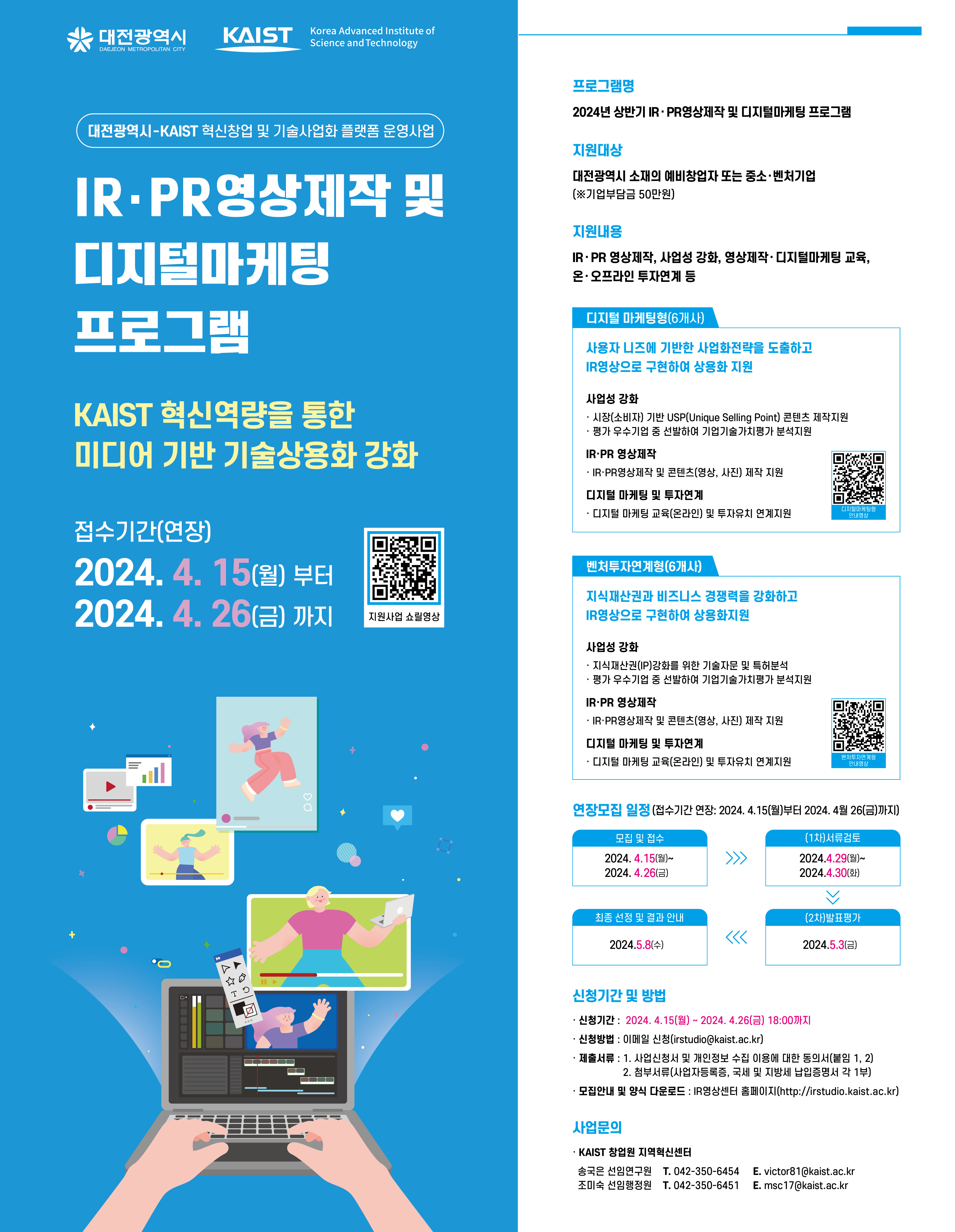 [대전시-카이스트] 2024년 상반기 IR·PR 영상제작 및 디지털 마케팅 프로그램(접수기간 연장)