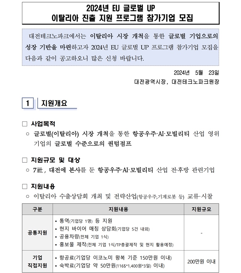 [대전테크노파크]2024 EU 글로벌 UP 이탈리아 진출지원프로그램 참가기업 모집안내