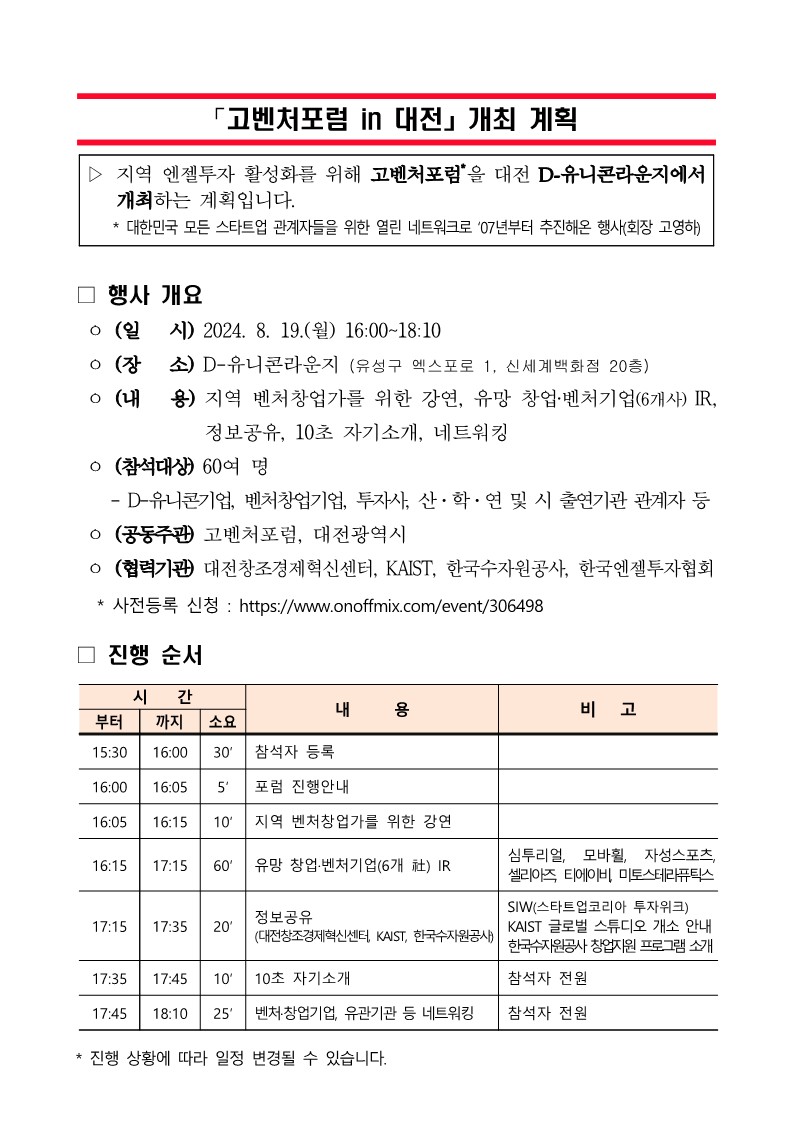 대전광역시와 함께 지역 엔젤투자 활성화를 위한 고벤처포럼이 대전 D-유니콘라운지에서 개최됩니다.