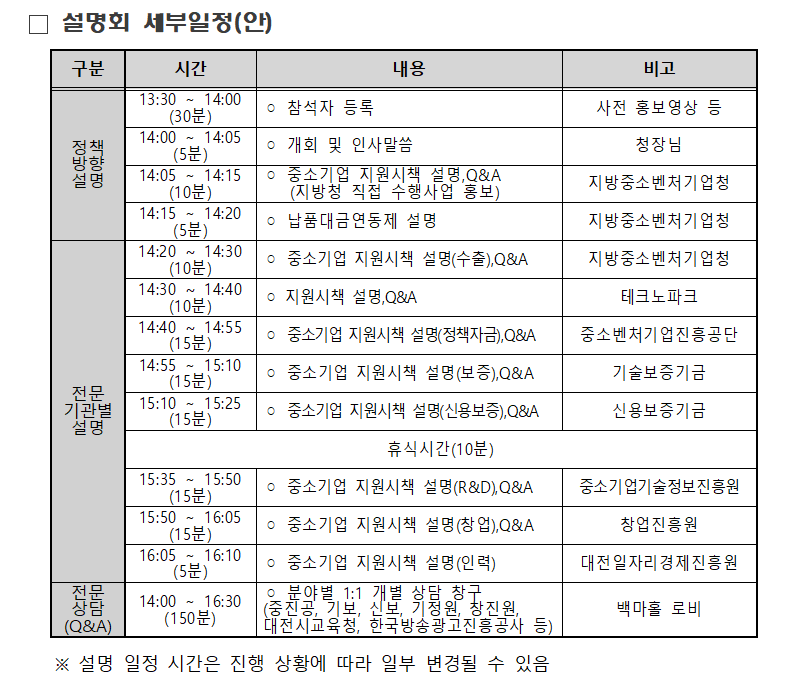 - 내용 : 2025년도 중소기업 지원사업 안내 및 분야별 1:1 상담 (자세한 일정은 아래 설명회 세부일정표를 참고하시기 바랍니다.)