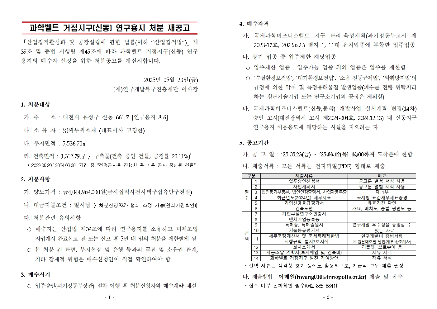 국제과학비즈니스벨트 신동 거점지구 연구용지 처분 공고를 안내드립니다.