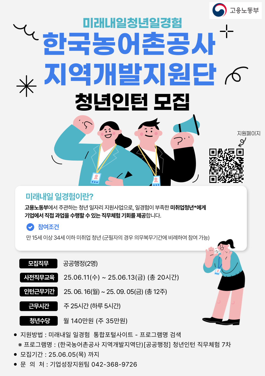 [청년모집ㅣ고용노동부] 한국농어촌공사 지역개발지원단 청년인턴 모집공고