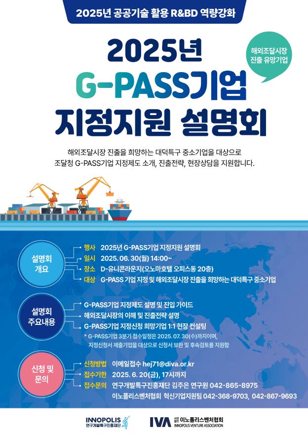 조달청 지정의 G-PASS기업 지정을 준비하거나, 해외조달시장 진출을 희망하는 특구기업의 많은 관심과 참여 바랍니다.