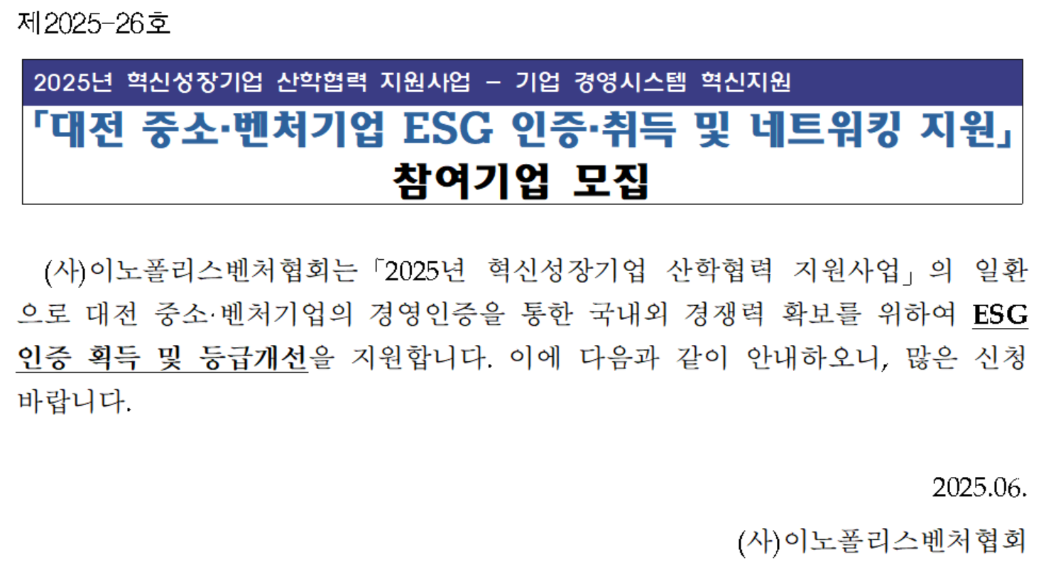 [기업모집]「대전 중소·벤처기업 ESG 인증·취득 및 네트워킹 지원」참여기업 모집