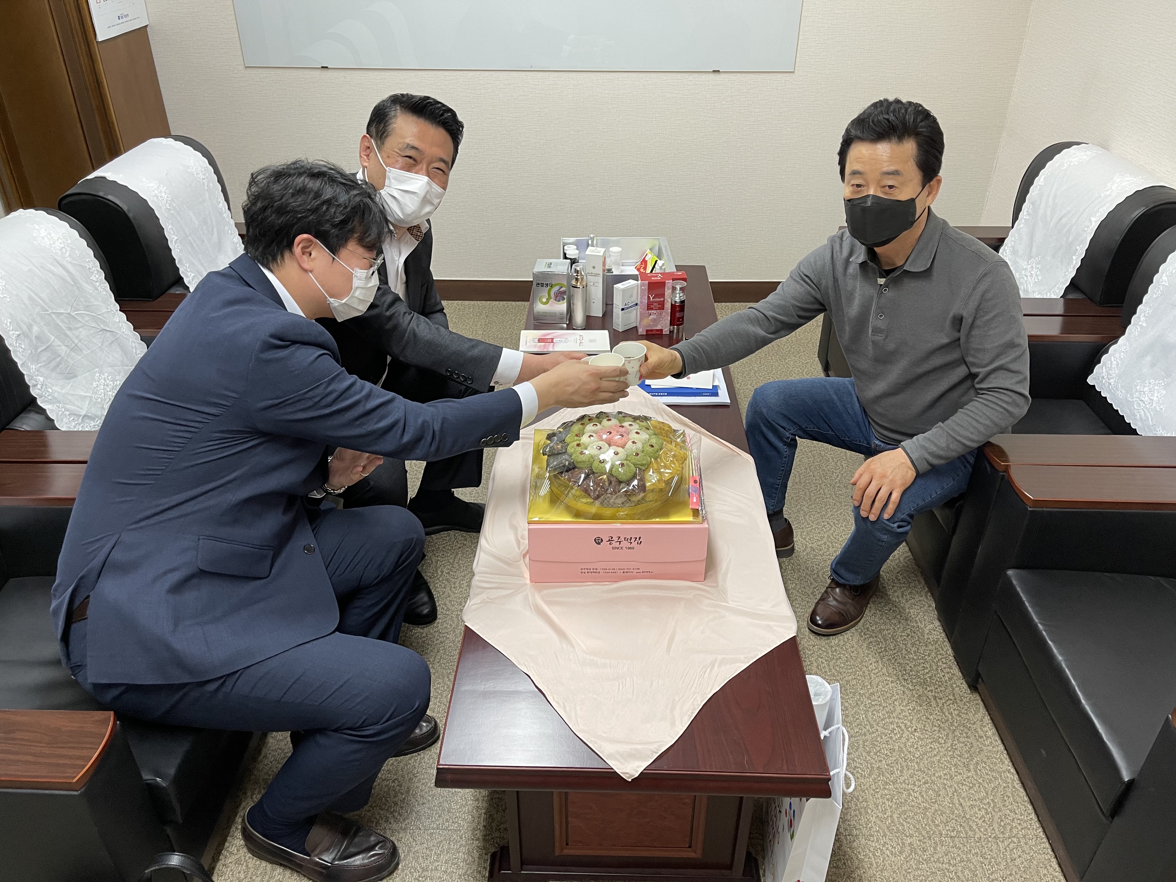 (주)지엘바이오테크의 창립기념일을 축하하기 위해 협회에서는 김시원 사무국장과 신혁준 팀장이 직접 방문하여 떡케이크와 축하서신을 전달하였습니다.